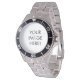 Has heft and feel of expensive stainless steel quartz watches. Good band with safety catch. I removed links, which is easy because engraved arrows show direction to push the linking pins. As always by this seller, the image (a railroad logo) is a perfect reproduction of my emailed image, and is precisely spaced and aligned.