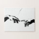 A black and white pop art style version of "The Creation of Adam" by Michelangelo. The original was painted on the ceiling of the Sistine Chapel and depicts God's creation of the first man, Adam, as told in Genesis.