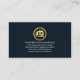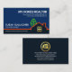 An orange building border near the base demarcates an upper blue layer against its darker counterpart. Just above the border is your prestigious name and job title with a slogan caption option to publicise your services. At the top corner lies the business name and contact details.