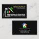 An all black cover features a creative building with colourful windows, a ladder and a green tree in the background. This design houses the job title "handyman service" with a list of services that you might offer underneath. You can change or edit the caption remarks to suit your own service needs. Near the top lies your prestigious name and the contact details.