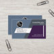 An array of artistic trapeziums with complimentary colours. On the left face, in the light cyan shade, you have your logo with a special white rectangle below it to house the business contacts. Moving over to the grey shade, you have your name and job title at the top of the card with a striking vertical white line pointing towards your contact details. Overleaf you get an additional logo option ; you can upload a photo if you so wish, the dimensions are 1,000x1,000pix. Beneath the logo is the business details with an optional slogan entry below. This is a simple card design with many options to customise. Suitable for all businesses and occupations.