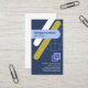 The horizontal blue stripe houses your prestigious name and job title. Near the base of the card is a blue interlock logo you can use with the slogan option and contact details directly underneath. You can change the caption remarks to the slogan caption to suit your own needs.