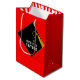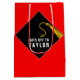 Graduation gift bag featuring black and gold cap design on a red background. Edit text to add senior grad's name.