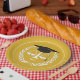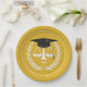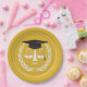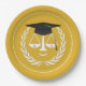 Unique law school grad party plates design featuring creative scales-of-justice personified wearing black and gold graduation cap.