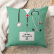 Personalised nurse pillow featuring hospital scrubs, a stethoscope and funny Swiss Army knife. Edit text to add name and professional credentials.