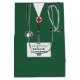 Unique nurse gift bag featuring green hospital scrubs, stethoscope, and a big congrats. Edit text to add nurse's name.