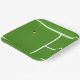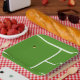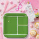 Unique tennis party plates featuring yellow tennis ball on a tennis court. Add your text to customize.