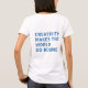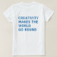 Tshirt for creatives features the text 'creativity makes the world go round' on the back of the tshirt in blue typography on a white background. Exclusively designed for you by Happy Dolphin Studio. If you need any help or matching products, please contact us through our store chat!