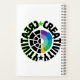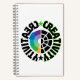 This image features a circular logo with the word "CREATIVITY" written in bold, black letters around the perimeter. The word is mirrored, with "CREATIVITY" appearing both clockwise and counterclockwise. Inside the circle, a black and white design resembling a target or a wheel fills the space. To the left of the wheel, there is a colourful pie chart with segments in purple, blue, light blue, green, and yellow. Two stars, one green and one black, are placed at the top and bottom of the wheel, respectively. The design suggests a connection between creativity and the power of ideas. The bold, black letters and the contrasting colours create a strong visual impact, emphasizing the importance of creativity.