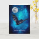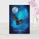 Design features a creepy bat flying on Halloween night . Full moon shines bright in a beautiful blue shaded starry night sky . Inside the card - Creepy bat flying in starry night sky . Personalise with your own message or delete text if you wish to leave it blank ( for handwritten message)