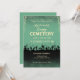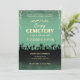 The invitation features a vintage-inspired design with a polished pine background and blonde accent text. The layout is symmetrical, with a central image of a creepy cemetery and a silhouette of zombies in the foreground. The overall aesthetic is rustic and eerie, creating a sense of anticipation for the event.