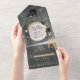 Creepy and cool but still elegant, Celestial Gothic Misty full Moon Wedding All in One Invitations that include the wedding info, RSVP, and meal choices postcard that your guests tear off and and send. Envelopes are not needed. These feature faux gold moon, skull with top hat, Victorian clock, bat, skeleton hands, ravens, branches, shimmery gold dust and a watchful eye. Great for an evening, dark and moody, mystical, gothic, halloween or a moonlight wedding!