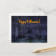 Happy Halloween postcard. Text is written in halloween orange. dark and scary forest with bare trees and a misty atmosphere. An old path leads off into the ominous darkness.