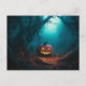 Imagine a moonlit night filled with whispers of the unknown – our postcard transports you to this mystical scene. The centred jack-o' lantern casts its warm glow, casting eerie shadows across the forest and inviting you to explore the secrets that lie within.