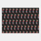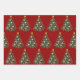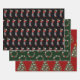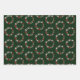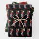 A creepy fun set of gothic skull Christmas wrapping paper. Three designs feature wreaths, stockings, and Christmas trees on backgrounds of black, red, and green.