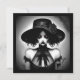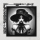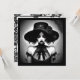 Personalised Halloween invitations. Creepy gothic woman in black dress and black hat with a black rose AI art. generativecontent