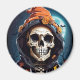 A magnet with an illustration of a skeleton wearing a hooded jacket with an orange witch's hat on top. A glowing moon in the back with a single bat flying nearby. Fun autumn Halloween design.