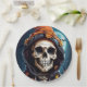 Paper plates with an illustration of a skeleton wearing a hooded jacket with an orange witch's hat on top. Surrounded by cute and spooky pumpkins. A glowing moon in the back with a single bat flying nearby. Fun autumn Halloween design.