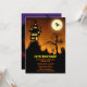 A scary haunted house perched on top of a hill with a grave yard against a dark orange sky. There's a full moon with a wicked witch flying across it. Very fun and scary design for your Halloween party invitations.