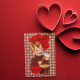 Unsettling retro valentine's day graphic, featuring a young boy in a flannel shirt, holding an axe, surrounded by hearts, with text that reads: " I'm Just Axin' You To Be My Valentine"