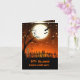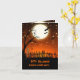 A walking dead skeleton standing near a hangman's noose in a grave yard with a full moon and orange sky background. Very fun and scary design for your Halloween greeting cards.