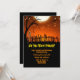 A walking dead skeleton standing near a hangman's noose in a grave yard with a full moon and orange sky background. Very fun and scary design for your Halloween party invitations.