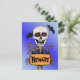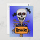 Design is from my original artwork. This smiling scary creepy white skull has glowing red eyes and looks menacing. It has spooky brown tree branches for arms and is holding a orange and black sign. There are black bats flying in the background. See my store Art by MAR for matching products with this design.