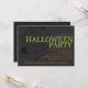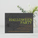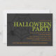This design features the words halloween party in green capital letters next to a scary black spider in a spider web and your party details in orange below. Set on a black background. Graphics ©Cheri Wenger.