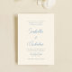 the front deign shows a wedding invitation in classic dusty blue calligraphy and typography with creme background. the design is classic and will be ideal for your wedding