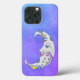 This iPhone case is has a white crescent moon decorated with colourful geometric shapes in blue, yellow and purple with a face in a purple and blue star dotted sky.