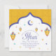 Invitation to Iftar or Eid Celebrations for Ramadan in shades of gold, blue, and white. This bright and colourful design has the outline of a mosque, a gold Arabic pattern, crescent moon and stars and fanous lanterns.