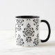 A decorative crest style repeat damask pattern of black detail on a white background.