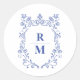 Elegant label with a blue floral crest. Easy to edit with your initials.