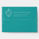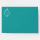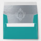 An elegant teal and silver envelope with a monogram initial in a vintage crest on all sides, recommended for a wedding with teal and silver colors. It is teal outside and faux silver foil inside. The vintage crest is also faux silver foil. The return address is printed on the flap, with the monogram in crest on its left. The monogram has the 2 initials of the bride and groom separated by a line.
