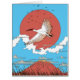 The crane's wings are outstretched, capturing a sense of graceful movement as it flies above stylised clouds and a silhouetted Mount Fuji. The iconic peak anchors the composition, grounding the scene in Japanese landscape tradition. Delicate lines and subtle shading define the crane's form, while the sun's radiant glow illuminates the scene.