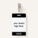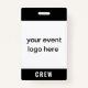 Customise this simple modern volunteer event crew staff badge with your logo. If your logo is square, it will fill up the white space entirely. If your logo is not square, it will show on a black background. The back of the badge can be personalised with the event name and date or year, or you can delete both to have an all black back. This minimalist crew staff badge is ideal for special events, festivals, concerts and conventions.