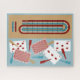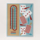 This puzzle is perfect for fans of playing cribbage. It features an illustration of a cribbage game board as well as playing cards and game pegs set against a light blue background.