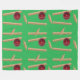 Featured on a green background is a red cricket ball hitting cricket stumps.