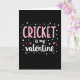 This greeting card features the phrase “CRICKET is my valentine” centered on a deep black background, turning a favorite sport into a sweet, affectionate shout-out 🥰. “CRICKET” sits at the top in rounded bubblegum pink letters, large and eye-catching like a happy announcement to someone special. Just beneath it, “is my” appears smaller in white, neatly tucked in as a quiet lead-in. The word “valentine” follows in white, written in a flowing cursive style that softens the look and adds a romantic touch ❤️. Around the text, tiny hearts and dots are sprinkled like confetti, suggesting a warm, teasing closeness between giver and receiver. The decorations alternate between pink and white, with a mix of filled shapes and outline-only hearts that keep the space lively without crowding it. The strong contrast of bright lettering against the dark backdrop makes every word easy to spot. Small pink and white hearts and dots float near the corners and along the sides, lightly framing the message.
