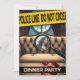 Uncover the mystery in style with this modern Murder Mystery Party Invitation, featuring police tape and a magnifying glass placed over a beige tufted sofa in a formal lounge area, highlighting a female suspects face, this is one clue you want to dig into to get to the bottom of this murder. Blood stained splatter on the frill of the sofa is the next step to finding the elusive fugitive. The oerall mood is of a revenge-filled case begging to be solved.
