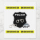 Police officer crime scene features cop car, badge, police handcuffs and crime scene tape that says Do Not Cross.