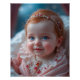 A hyper-detailed, ethereal digital painting of a one-week-old baby girl with a gentle, sweet smile. She has soft crimson hair forming a delicate halo and flawless, cherubic skin with a subtle pink blush. Her sparkling light blue eyes are framed by fine baby lashes, and a faint dusting of gold glitter twinkles on her cheeks. She wears tiny, exquisite ornaments: a miniature coronet or headband of gold or silver threads with tiny red gemstones and pearls, small stud earrings, and a delicate lace-like collar adorned with miniature red baubles and embroidery. Swaddled in luxurious cream and pale pink fabrics, she sits against a soft, dreamy bokeh background in cool blues, whites, and subtle reds. Magical, soft directional lighting highlights the glow of her skin, the vibrancy of her hair, and the intricate adornments, evoking innocence, whimsy, and precious beauty.
