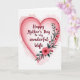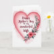 This greeting card features a bright white background with a large heart centred on the front, shaded in soft rose and blush tones with gently feathered edges. Inside the heart, a flowing line of deep crimson lettering sits across the middle, addressing a loved one in a way that suggests closeness and appreciation ❤️. Along the right side of the heart, a thin vine climbs upward, dotted with dark green leaves and small red blossoms that feel like little affectionate gestures tucked into the design. Near the lower right, a larger fuchsia flower opens in layered petals with a darker centre, adding a romantic focal point. Smaller blooms and bits of greenery cluster around it, as if they’re leaning in towards the heart and its message. The contrast of warm pinks and reds against the white space keeps the layout airy while still intimate, like a quiet note shared between two people 🌼. The text remains contained within the heart, while the vine and flowers trace the outer right edge and gather most densely at the lower right corner.