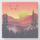 An abstract landscape of a mountain scene with a sunrise and trees in bold shades of crimson and red.