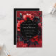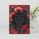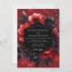 Experience a mood of dramatic romance with this elegant design. A lush arrangement of painterly blooms in shades of vibrant crimson and deep scarlet burst from a background of shadow. Dark charcoal and black foliage and flowers provide a striking contrast, creating an atmosphere of sophisticated and passionate allure for your special day.