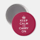 This classic "Keep Calm and Carry On" design features white text on a crimson red background.