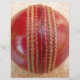 The artwork features a tightly cropped view of a red leather cricket ball. The focus is sharp on the central seam and the surrounding leather, showcasing the detailed stitching and the texture of the ball's surface. The composition is simple yet impactful, drawing the viewer's eye to the craftsmanship and the iconic nature of the object.
