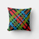 This cheerful throw pillow displays a colourful abstract pattern of crisscross lines in red, orange, green, yellow, blue and black on a black background. The image is repeated on the back.