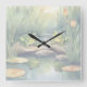 This is a fun clock there are two little dogs getting ready for some croaking time, they are sitting on a rock with yellow flowers sme lilly pads and some morning fog.