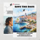 A plain, simple, modern yet elegant photo template has a watercolor painting of the Dubrovnik coastline on the front and a photo template for the wedding couples photograph on the back. The front and back both have the black silhouette of a small aeroplane with a dotted line behind it showing its flight path and the back has a red destination location symbol for the name of the town you will be having your wedding at in Croatia, plus a qr code template. If the qr code is not required, simply delete it. Personalise the editable templates to suit your requirements.